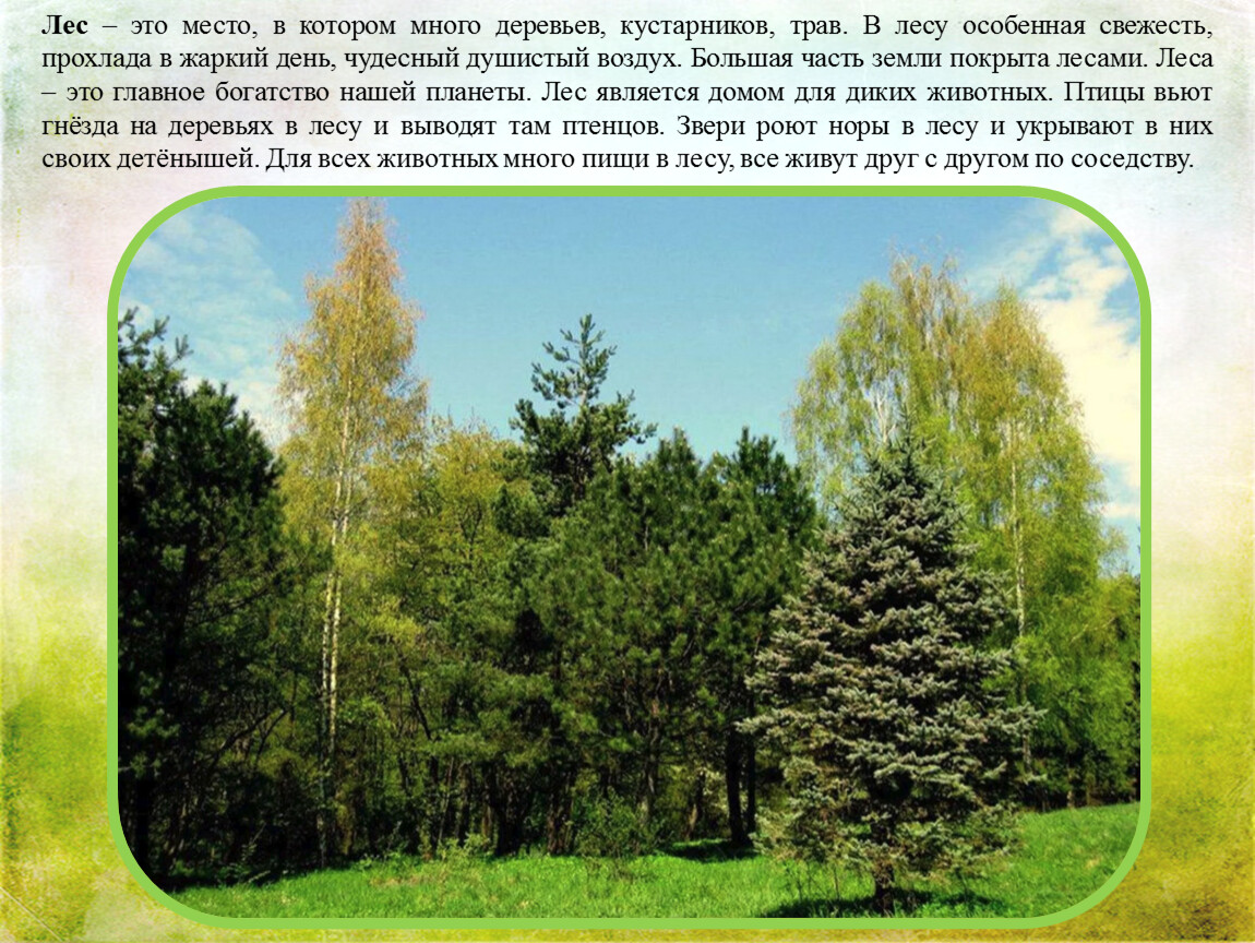 Лес – это место, в котором много деревьев, кустарников, трав. В лесу особенная свежесть, прохлада в жаркий день, чудесный душистый воздух. Большая часть земли покрыта лесами. Леса – это главное богатство нашей планеты. Лес является домом для диких животных. Птицы вьют гнёзда на деревьях в лесу и выводят там птенцов. Звери роют норы в лесу и укрывают в них своих детёнышей. Для всех животных много пищи в лесу, все живут друг с другом по соседству.