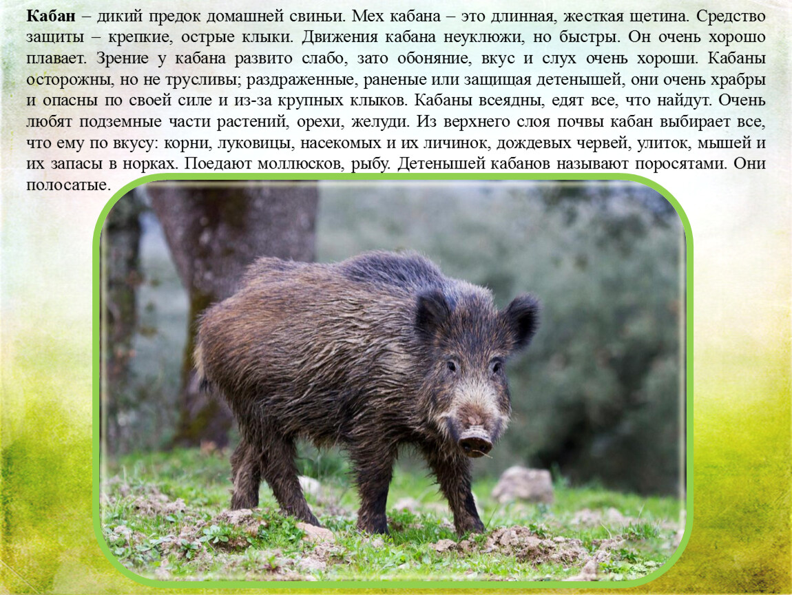 Кабан – дикий предок домашней свиньи. Мех кабана – это длинная, жесткая щетина. Средство защиты – крепкие, острые клыки. Движения кабана неуклюжи, но быстры. Он очень хорошо плавает. Зрение у кабана развито слабо, зато обоняние, вкус и слух очень хороши. Кабаны осторожны, но не трусливы; раздраженные, раненые или защищая детенышей, они очень храбры и опасны по своей силе и из-за крупных клыков. Кабаны всеядны, едят все, что найдут. Очень любят подземные части растений, орехи, желуди. Из верхнего слоя почвы кабан выбирает все, что ему по вкусу: корни, луковицы, насекомых и их личинок, дождевых червей, улиток, мышей и их запасы в норках. Поедают моллюсков, рыбу. Детенышей кабанов называют поросятами. Они полосатые.