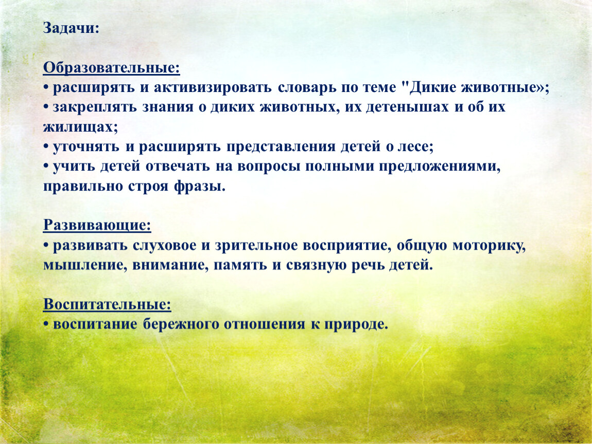 • закреплять знания о диких животных, их детенышах и об их жилищах;