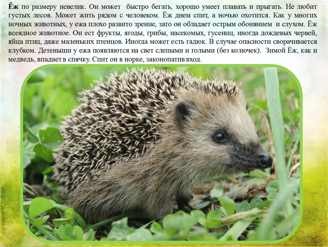 Ёж по размеру невелик. Он может быстро бегать, хорошо умеет плавать и прыгать. Не любит густых лесов. Может жить рядом с человеком. Ёж днем спит, а ночью охотится. Как у многих ночных животных, у ежа плохо развито зрение, зато он обладает острым обонянием и слухом. Ёж всеядное животное. Он ест фрукты, ягоды, грибы, насекомых, гусениц, иногда дождевых червей, яйца птиц, даже маленьких птенцов. Иногда может есть гадюк. В случае опасности сворачивается клубком. Детеныши у ежа появляются на свет слепыми и голыми (без колючек). Зимой Ёж, как и медведь, впадает в спячку. Спит он в норке, законопатив вход.