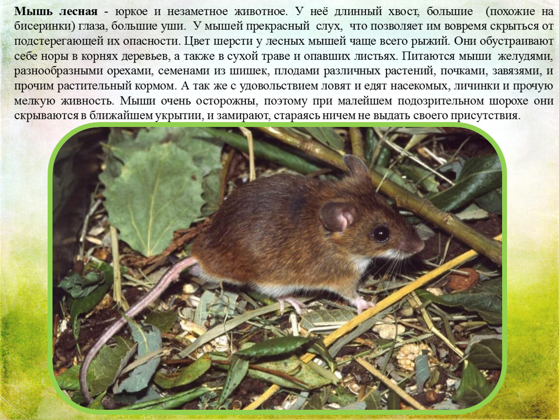 Мышь лесная - юркое и незаметное животное. У неё длинный хвост, большие (похожие на бисеринки) глаза, большие уши. У мышей прекрасный слух, что позволяет им вовремя скрыться от подстерегающей их опасности. Цвет шерсти у лесных мышей чаще всего рыжий. Они обустраивают себе норы в корнях деревьев, а также в сухой траве и опавших листьях. Питаются мыши желудями, разнообразными орехами, семенами из шишек, плодами различных растений, почками, завязями, и прочим растительный кормом. А так же с удовольствием ловят и едят насекомых, личинки и прочую мелкую живность. Мыши очень осторожны, поэтому при малейшем подозрительном шорохе они скрываются в ближайшем укрытии, и замирают, стараясь ничем не выдать своего присутствия.