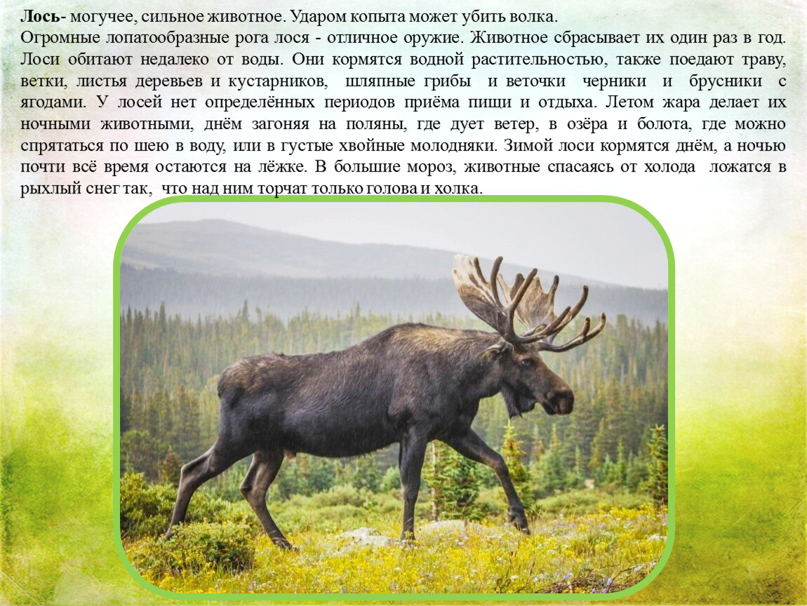 Огромные лопатообразные рога лося - отличное оружие. Животное сбрасывает их один раз в год. Лоси обитают недалеко от воды. Они кормятся водной растительностью, также поедают траву, ветки, листья деревьев и кустарников, шляпные грибы и веточки черники и брусники с ягодами. У лосей нет определённых периодов приёма пищи и отдыха. Летом жара делает их ночными животными, днём загоняя на поляны, где дует ветер, в озёра и болота, где можно спрятаться по шею в воду, или в густые хвойные молодняки. Зимой лоси кормятся днём, а ночью почти всё время остаются на лёжке. В большие мороз, животные спасаясь от холода ложатся в рыхлый снег так, что над ним торчат только голова и холка.