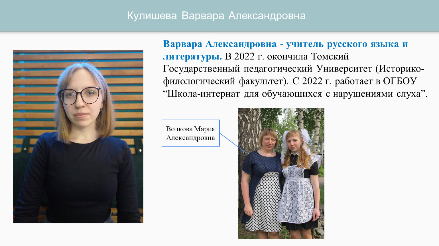 Варвара Александровна - учитель русского языка и литературы. В 2022 г. окончила Томский Государственный педагогический Университет (Историко-филологический факультет). С 2022 г. работает в ОГБОУ “Школа-интернат для обучающихся с нарушениями слуха”.