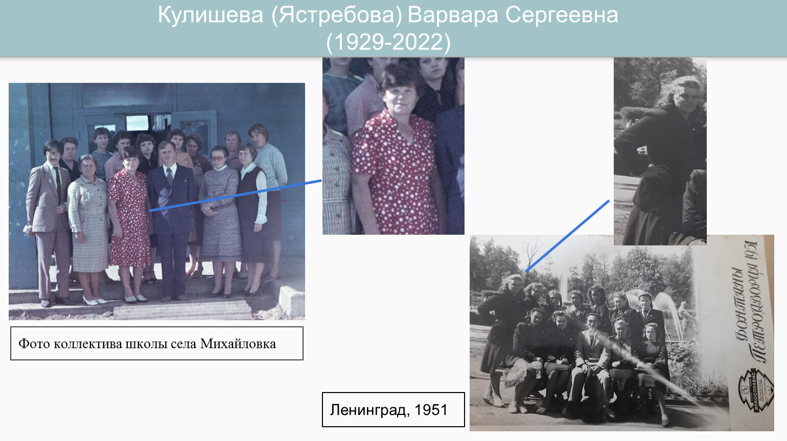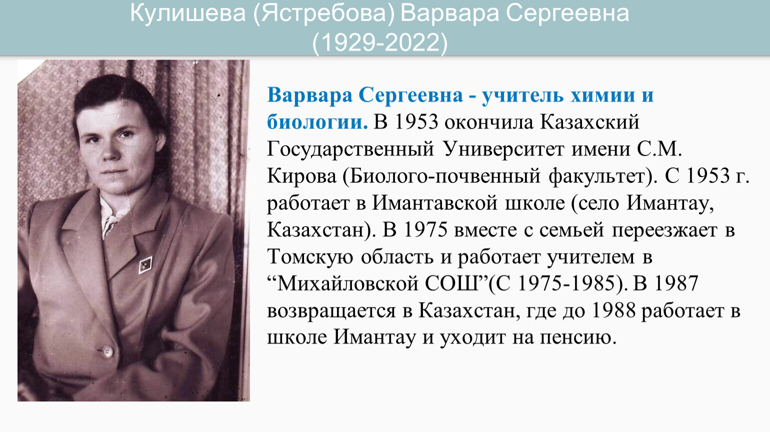 Варвара Сергеевна - учитель химии и биологии. В 1953 окончила Казахский Государственный Университет имени С.М. Кирова (Биолого-почвенный факультет). С 1953 г. работает в Имантавской школе (село Имантау, Казахстан). В 1975 вместе с семьей переезжает в Томскую область и работает учителем в “Михайловской СОШ”(С 1975-1985). В 1987 возвращается в Казахстан, где до 1988 работает в школе Имантау и уходит на пенсию.