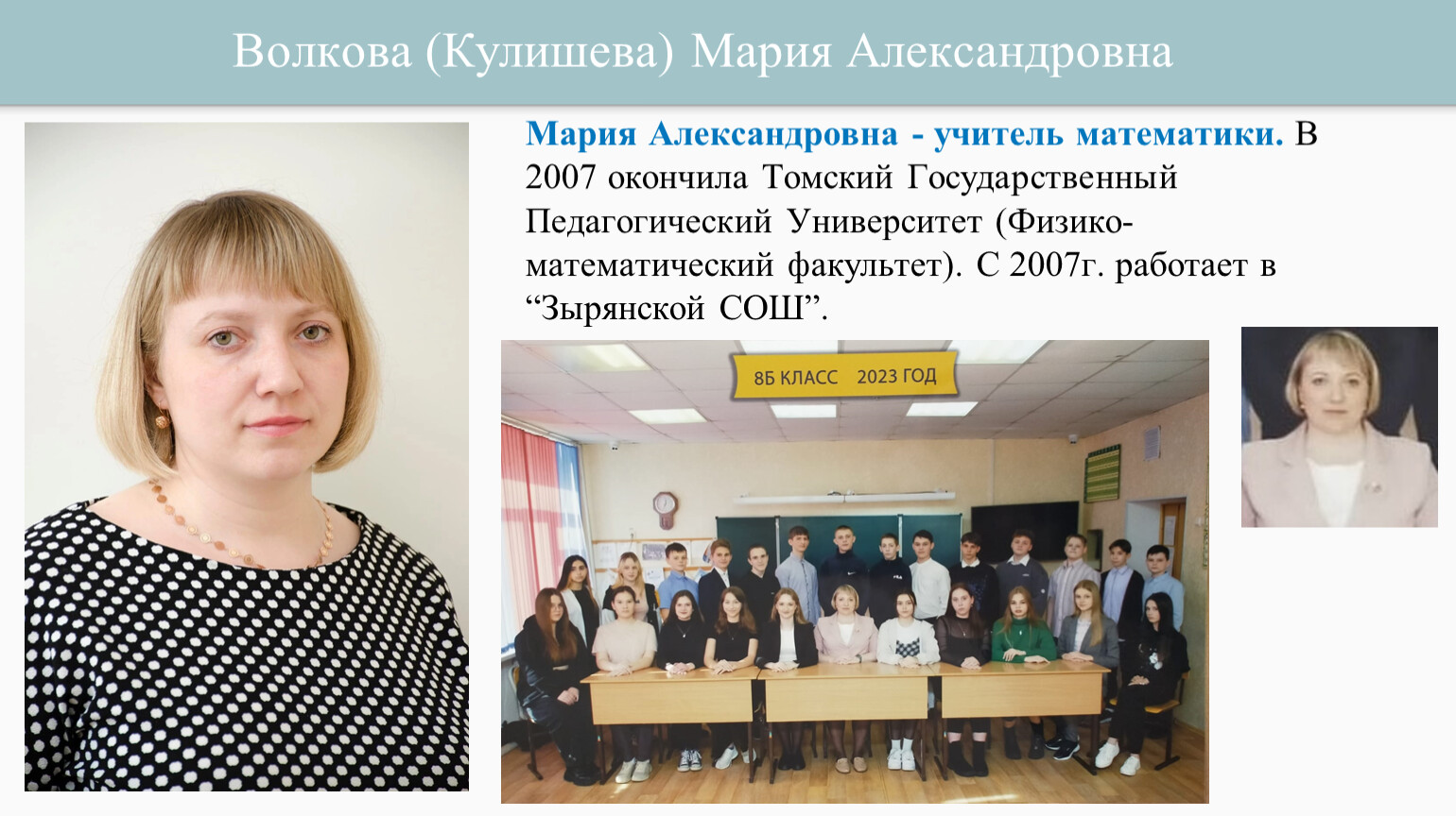 Мария Александровна - учитель математики. В 2007 окончила Томский Государственный Педагогический Университет (Физико-математический факультет). С 2007г. работает в “Зырянской СОШ”.