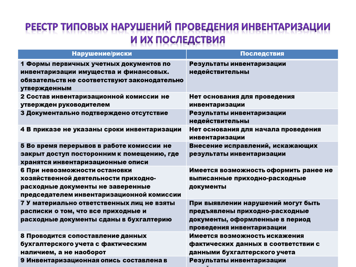 Реестр типовых нарушений проведения инвентаризации и их последствия