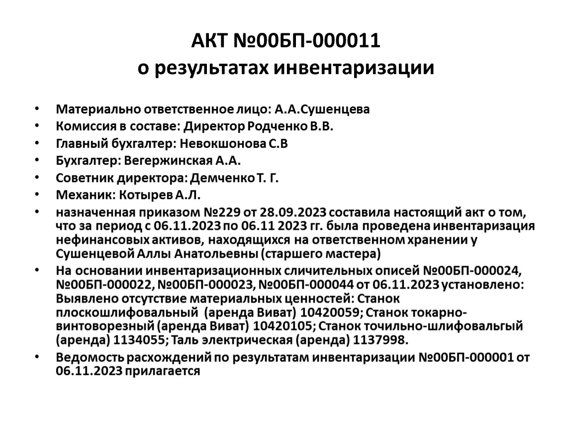 На основании инвентаризационных сличительных описей №00БП-000024, №00БП-000022, №00БП-000023, №00БП-000044 от 06.11.2023 установлено: Выявлено отсутствие материальных ценностей: Станок плоскошлифовальный (аренда Виват) 10420059; Станок токарно-винтоворезный (аренда Виват) 10420105; Станок точильно-шлифовальгый (аренда) 1134055; Таль электрическая (аренда) 1137998.