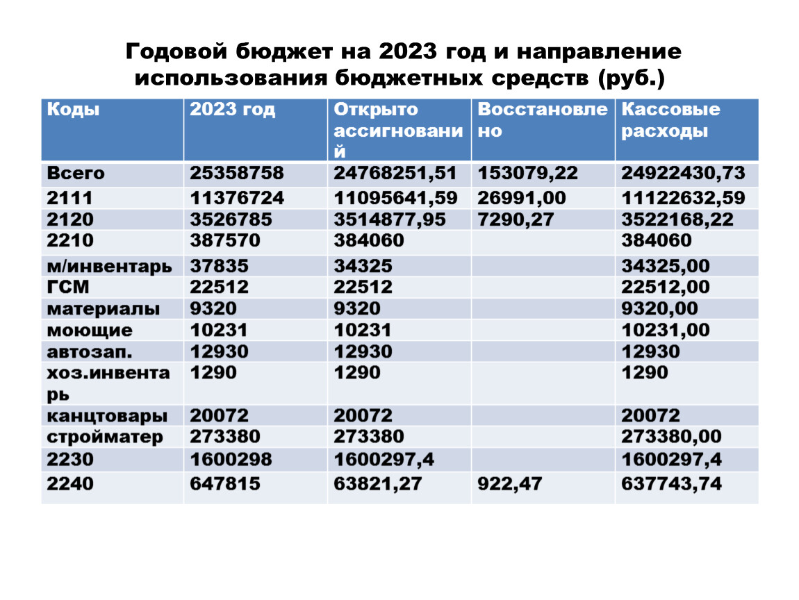 Коды | 2023 год | Открыто ассигнований | Восстановлено | Кассовые расходы |