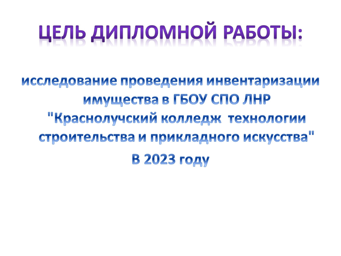 Дипломная работана тему:ИНВЕНТАРИЗАЦИЯ ИМУЩЕСТВА ПРЕДПРИЯТИЯ ГБОУ СПО ЛНР «КРАСНОЛУЧСКИЙ КОЛЛЕДЖ ТЕХНОЛОГИИ СТРОИТЕЛЬСТВА И ПРИКЛАДНОГО ИСКУССТВА»