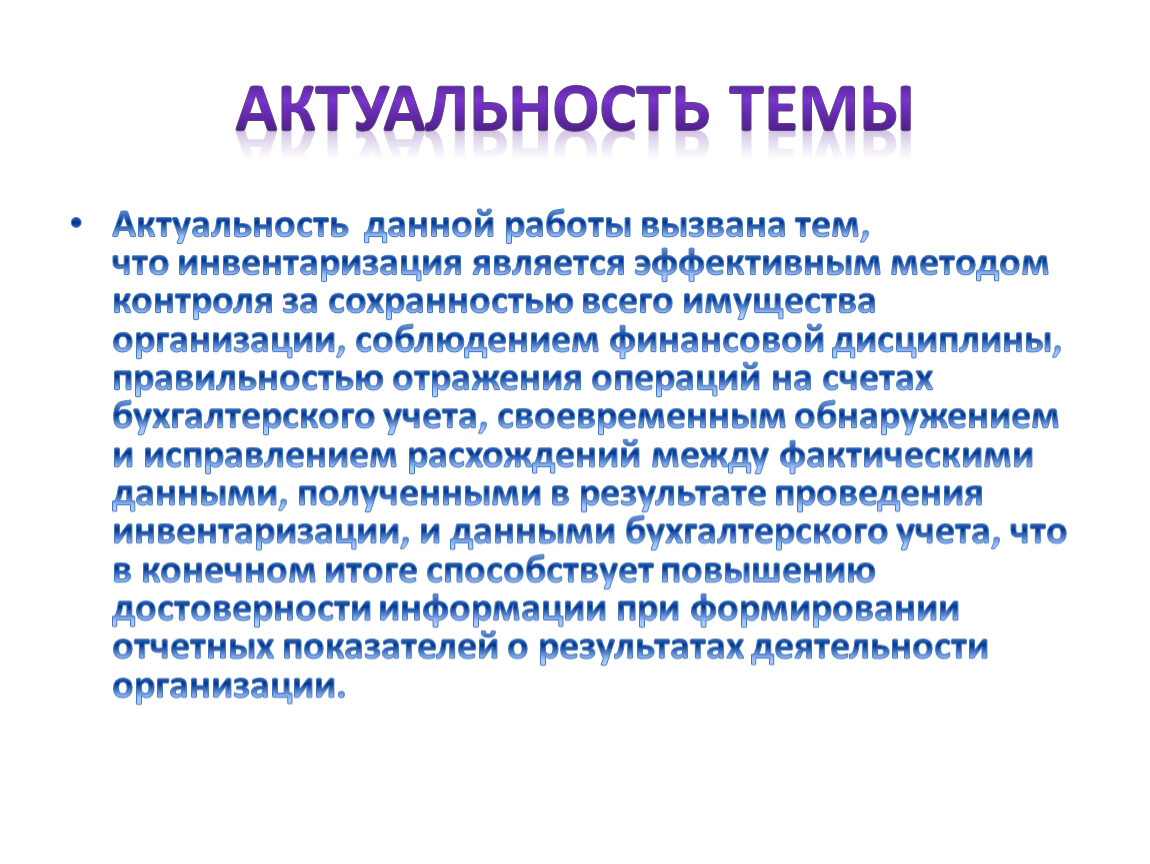 Актуальность данной работы вызвана тем, что инвентаризация является эффективным методом контроля за сохранностью всего имущества организации, соблюдением финансовой дисциплины, правильностью отражения операций на счетах бухгалтерского учета, своевременным обнаружением и исправлением расхождений между фактическими данными, полученными в результате проведения инвентаризации, и данными бухгалтерского учета, что в конечном итоге способствует повышению достоверности информации при формировании отчетных показателей о результатах деятельности организации.