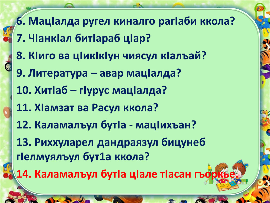 14. Каламалъул бутIа цIале тIасан гъоркье.