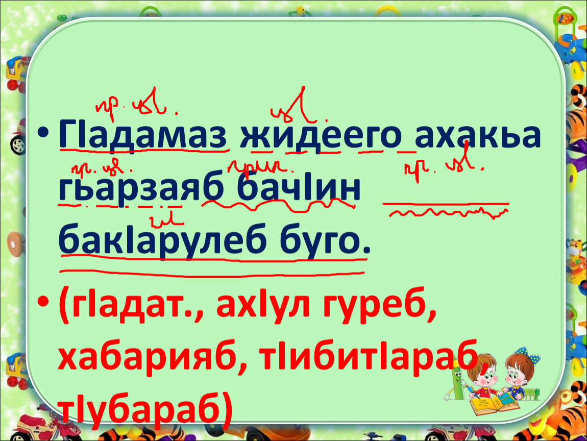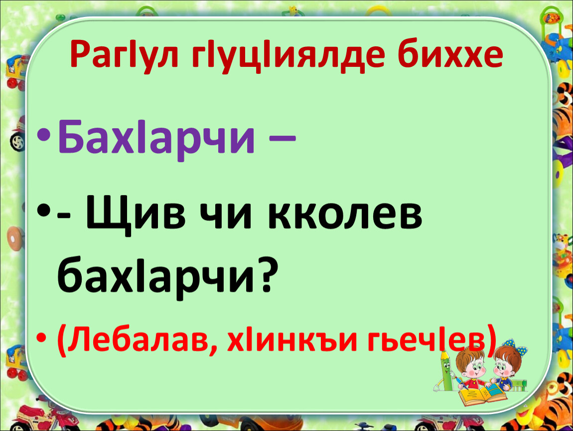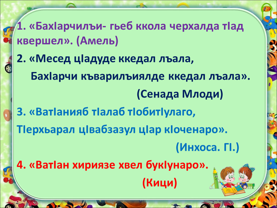 1. «БахIарчилъи- гьеб ккола черхалда тIад квершел». (Амель)