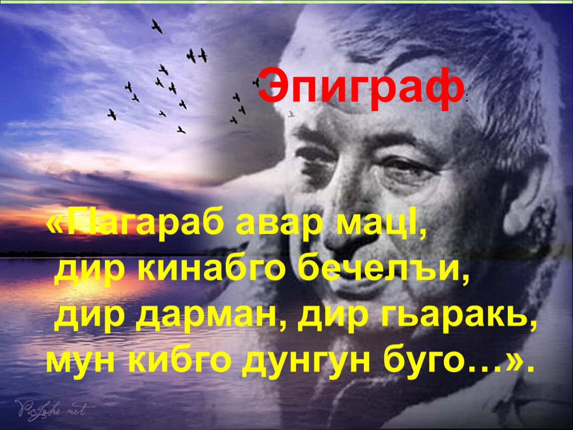 «Г1агараб авар мац1, дир кинабго бечелъи, дир дарман, дир гьаракь, мун кибго дунгун буго…».