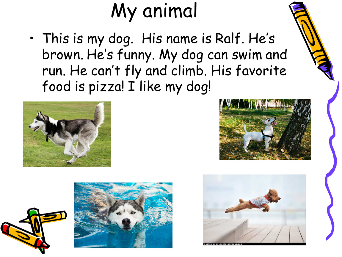 This is my dog. His name is Ralf. He’s brown. He’s funny. My dog can swim and run. He can’t fly and climb. His favorite food is pizza! I like my dog!