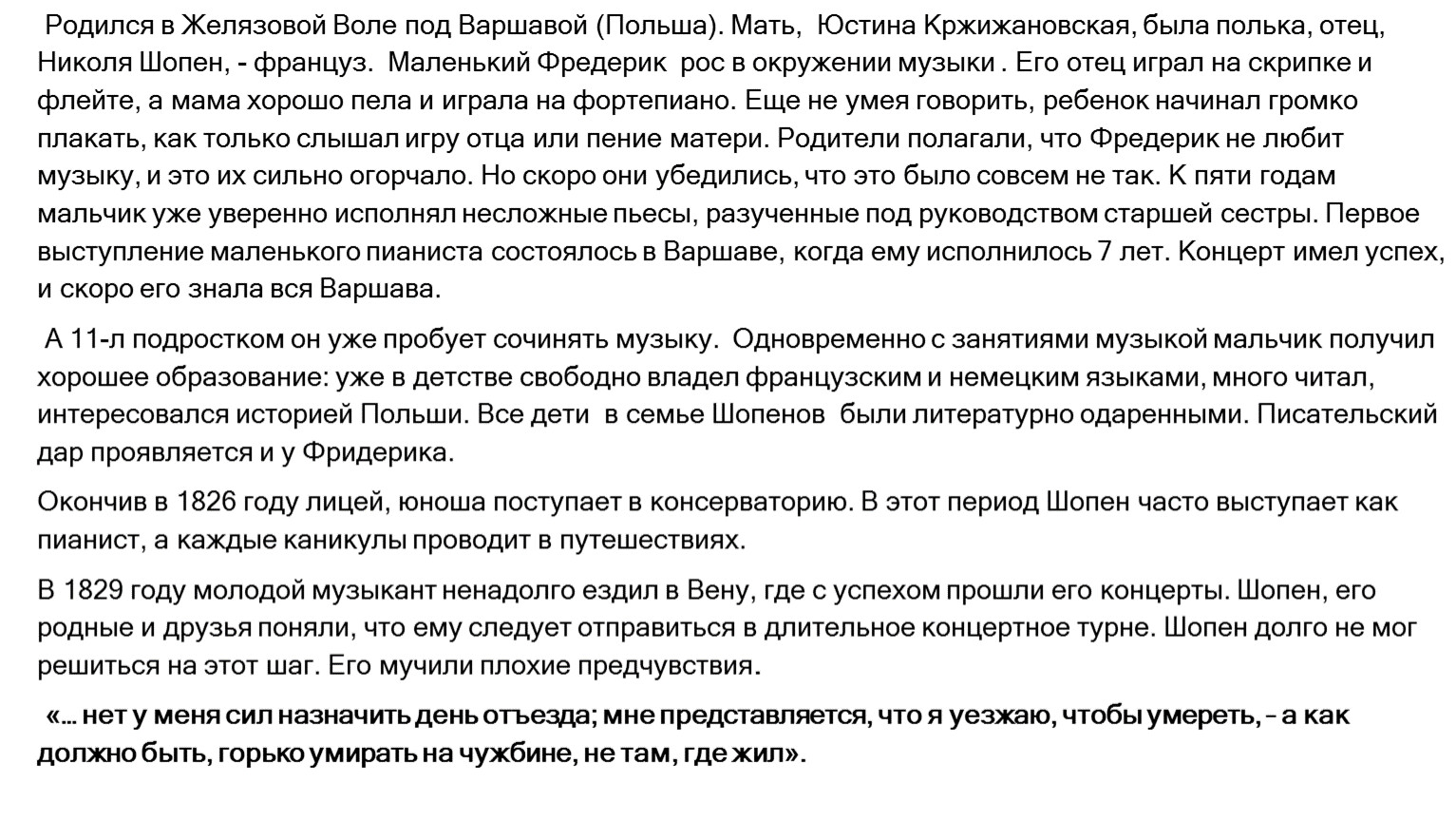 Из письма Шопена: « Милая моя, далекая, единственная! Почему наша жизнь так устроена, что я должен находиться вдали от тебя!.. Милая Родина, каждую ночь ты приходишь ко мне неясной мелодией не то песни, не то любимого танца - мазурки, и так хочется, чтобы этот сон никогда не кончался…»