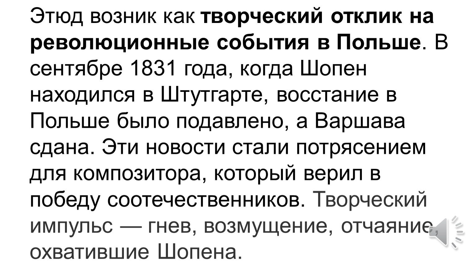 У: Направляясь во Францию, Шопена настигло известие о начавшемся в Варшаве национально-освободительном восстании. Он хотел вернуться, но ехать ему в Польшу было нельзя. И юноша, полный романтических мечтаний, сразу превратился в бойца. И душа его стала колоколом свободы. Прозвучавший фрагмент - « Революционный этюд» - первый музыкальный отклик композитора на события в Польше. Изменился ли почерк композитора? Какой стала его речь? Какие средства выразительности?