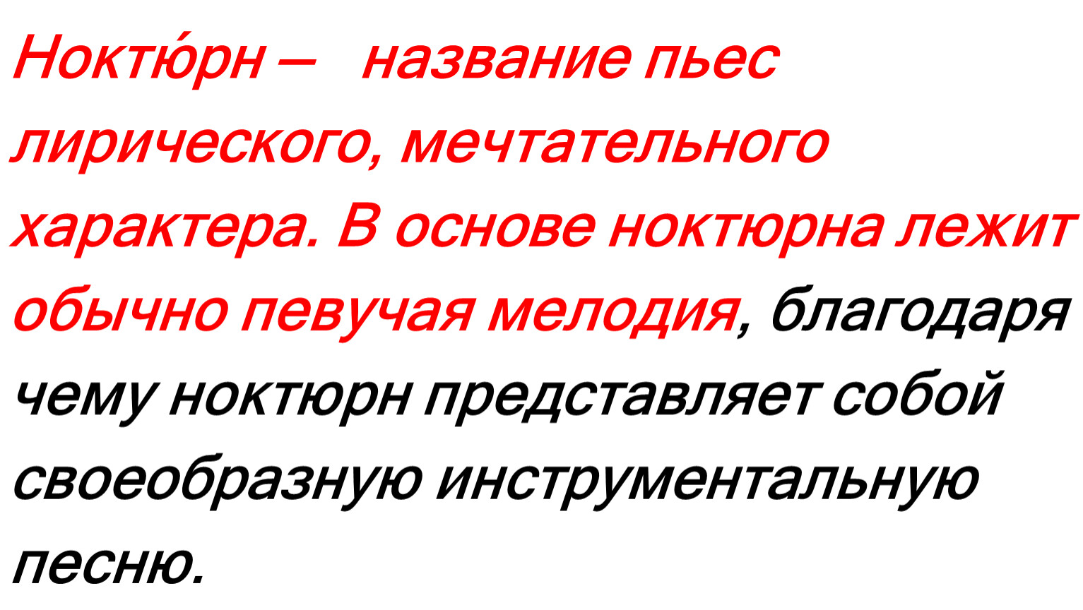 Ноктю́рн — название пьес лирического, мечтательного характера. В основе ноктюрна лежит обычно певучая мелодия, благодаря чему ноктюрн представляет собой своеобразную инструментальную песню.