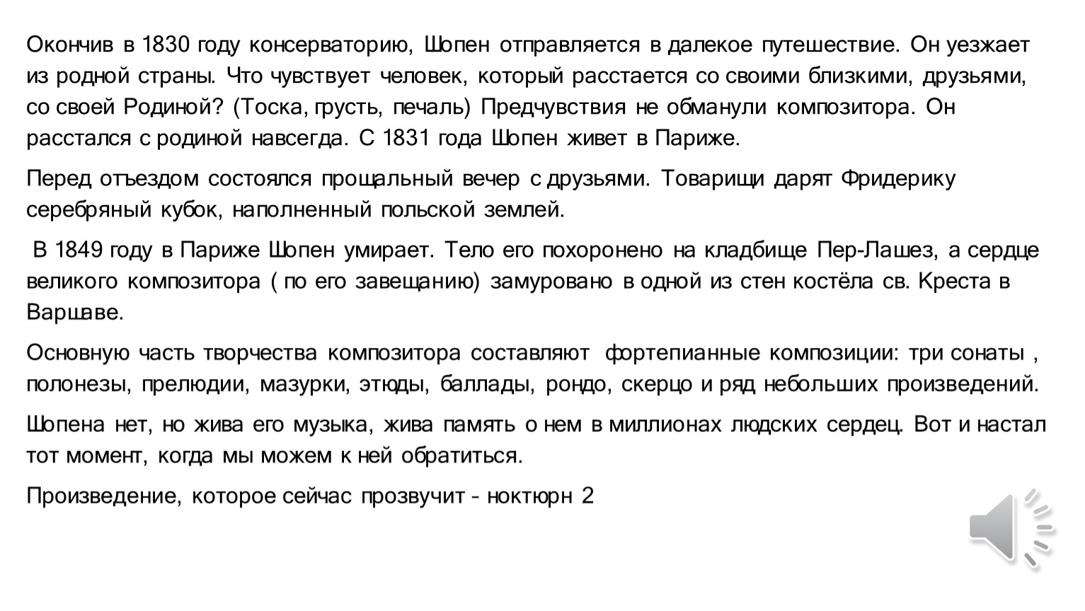 Окончив в 1830 году консерваторию, Шопен отправляется в далекое путешествие. Он уезжает из родной страны. Что чувствует человек, который расстается со своими близкими, друзьями, со своей Родиной? (Тоска, грусть, печаль) Предчувствия не обманули композитора. Он расстался с родиной навсегда. С 1831 года Шопен живет в Париже.