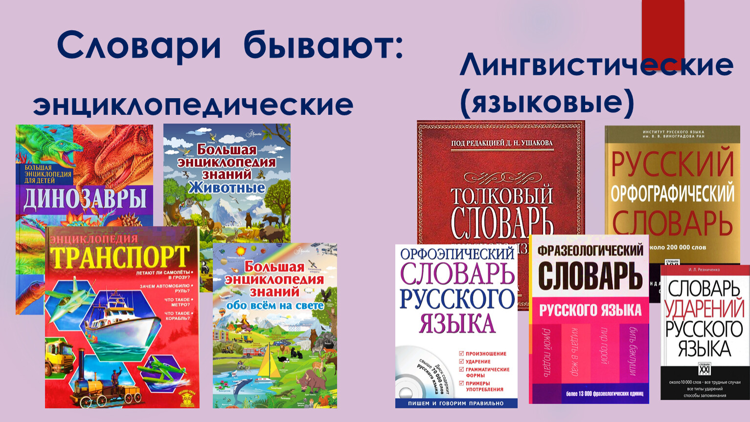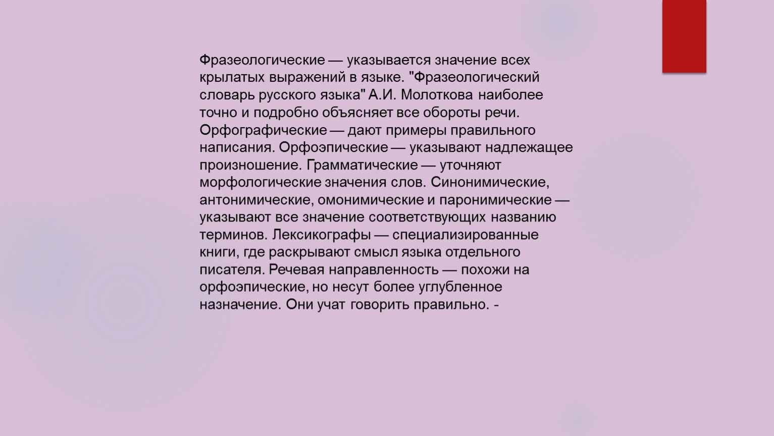 Фразеологические — указывается значение всех крылатых выражений в языке. "Фразеологический словарь русского языка" А.И. Молоткова наиболее точно и подробно объясняет все обороты речи. Орфографические — дают примеры правильного написания. Орфоэпические — указывают надлежащее произношение. Грамматические — уточняют морфологические значения слов. Синонимические, антонимические, омонимические и паронимические — указывают все значение соответствующих названию терминов. Лексикографы — специализированные книги, где раскрывают смысл языка отдельного писателя. Речевая направленность — похожи на орфоэпические, но несут более углубленное назначение. Они учат говорить правильно. -