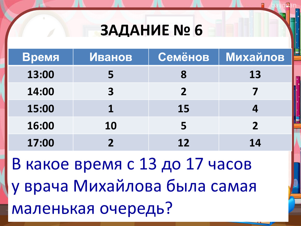 Время | Иванов | Семёнов | Михайлов |