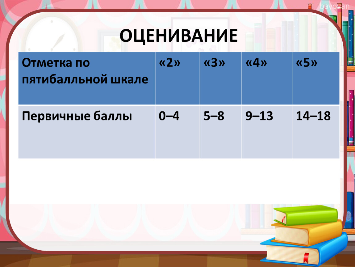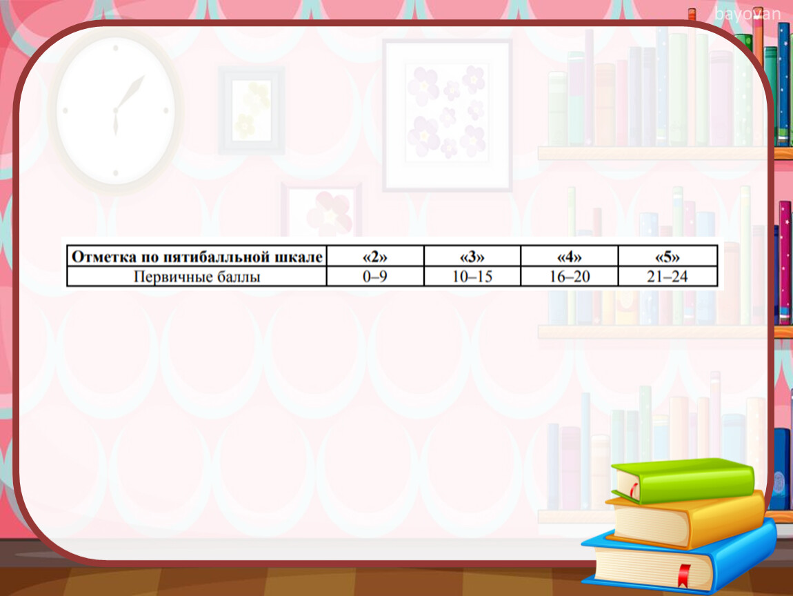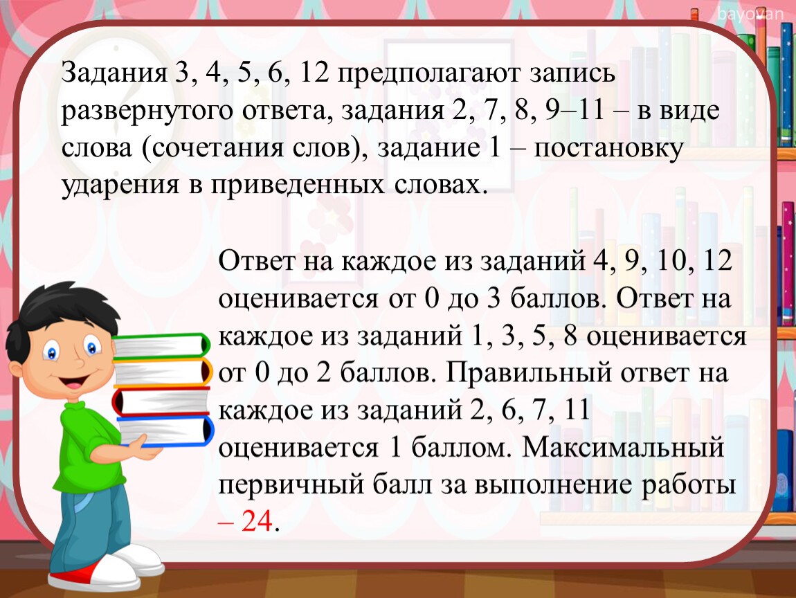 Ответ на каждое из заданий 4, 9, 10, 12 оценивается от 0 до 3 баллов. Ответ на каждое из заданий 1, 3, 5, 8 оценивается от 0 до 2 баллов. Правильный ответ на каждое из заданий 2, 6, 7, 11 оценивается 1 баллом. Максимальный первичный балл за выполнение работы – 24.