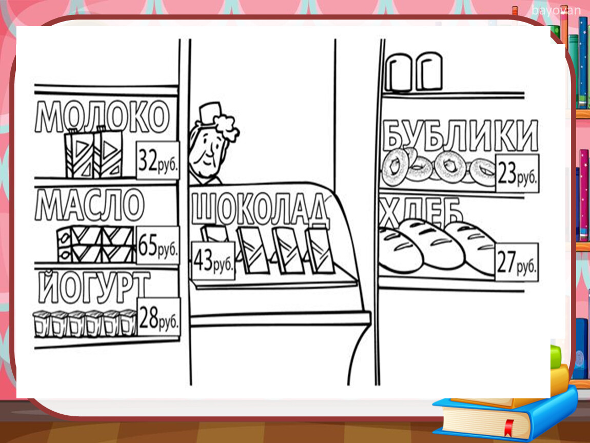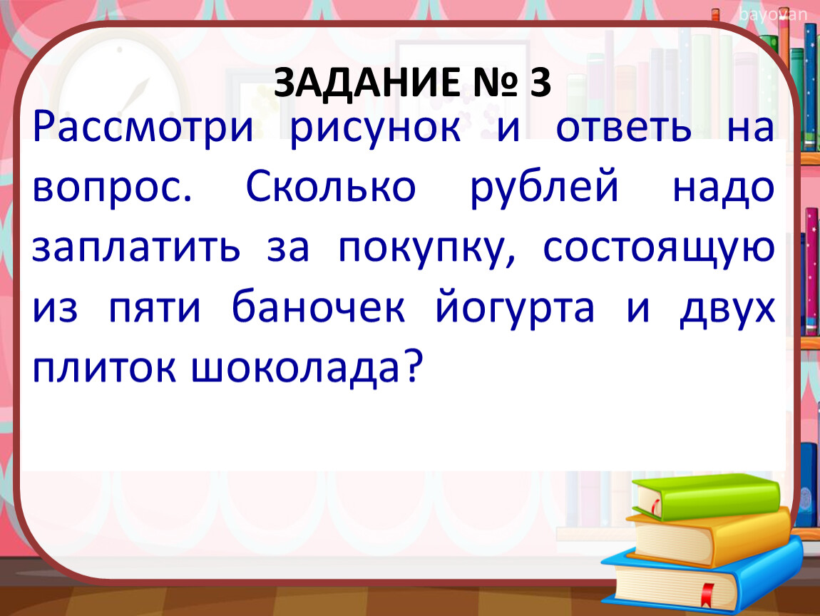 Рассмотри рисунок и ответь на вопрос. Сколько рублей надо заплатить за покупку, состоящую из пяти баночек йогурта и двух плиток шоколада?