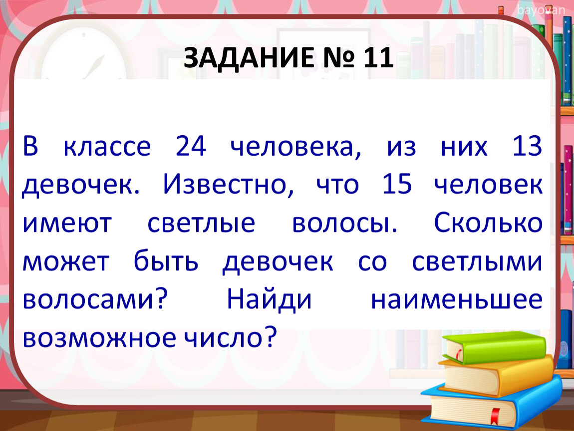 В классе 24 человека, из них 13 девочек. Известно, что 15 человек имеют светлые волосы. Сколько может быть девочек со светлыми волосами? Найди наименьшее возможное число?
