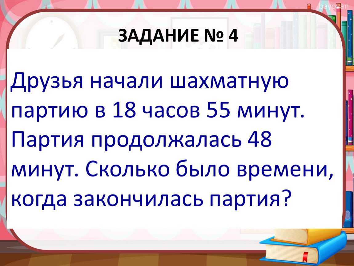 Друзья начали шахматную партию в 18 часов 55 минут. Партия продолжалась 48 минут. Сколько было времени, когда закончилась партия?