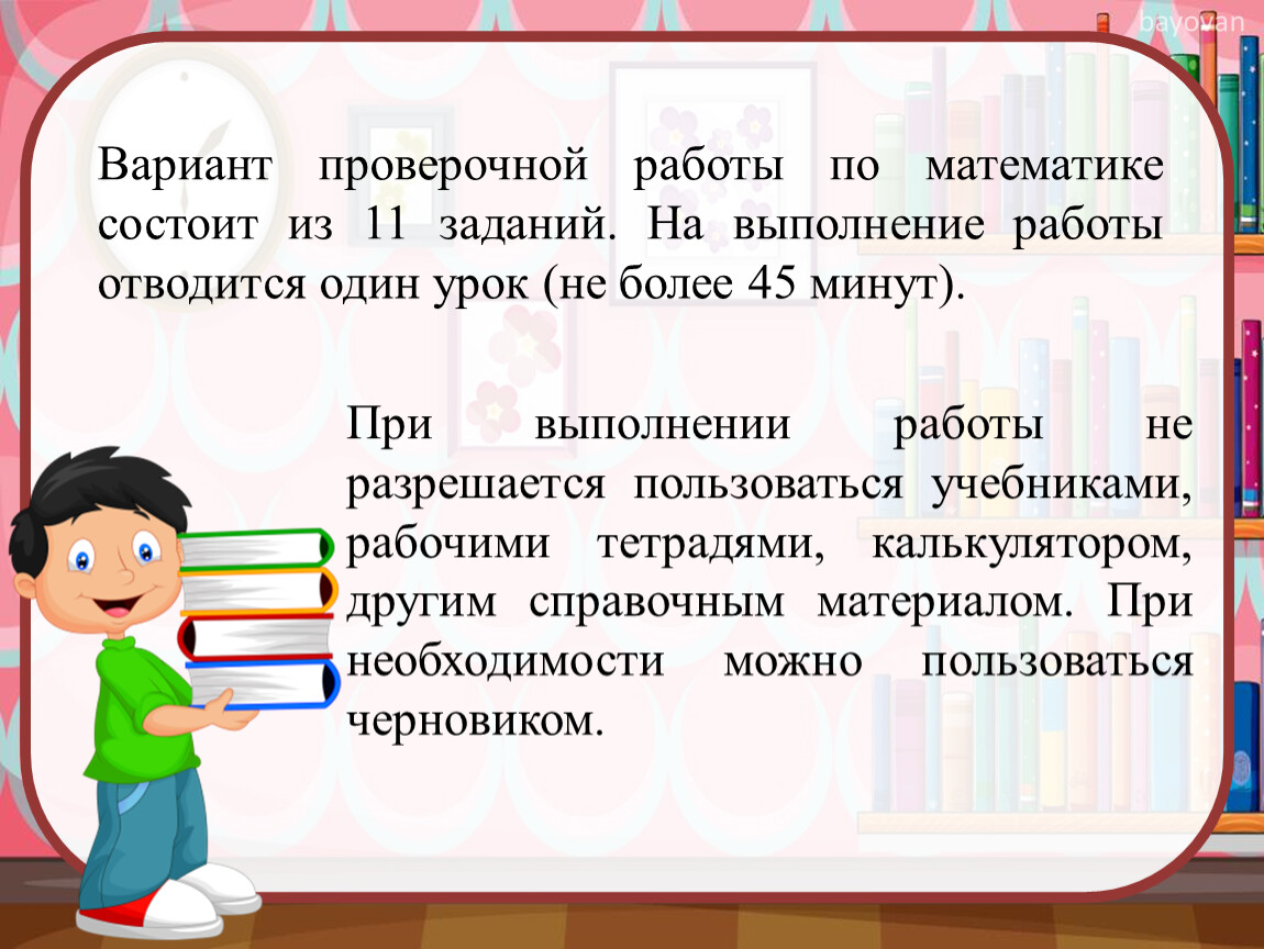Вариант проверочной работы по математике состоит из 11 заданий. На выполнение работы отводится один урок (не более 45 минут).