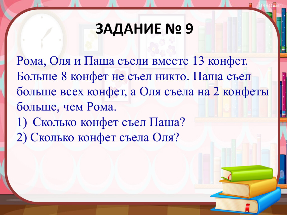Рома, Оля и Паша съели вместе 13 конфет. Больше 8 конфет не съел никто. Паша съел больше всех конфет, а Оля съела на 2 конфеты больше, чем Рома.