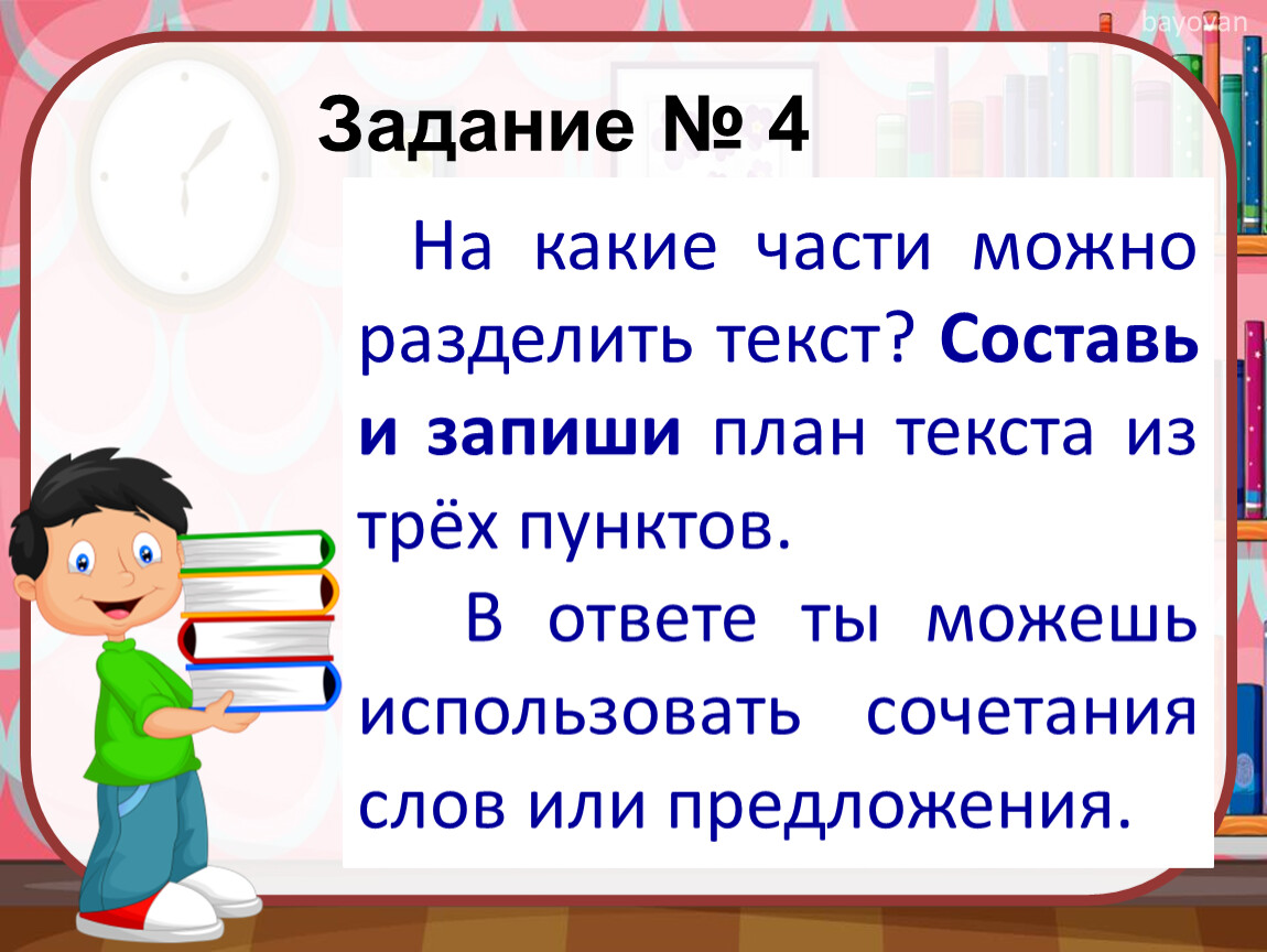 На какие части можно разделить текст? Составь и запиши план текста из трёх пунктов.