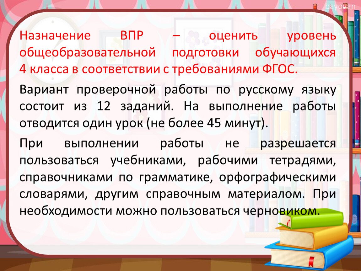 Вариант проверочной работы по русскому языку состоит из 12 заданий. На выполнение работы отводится один урок (не более 45 минут).
