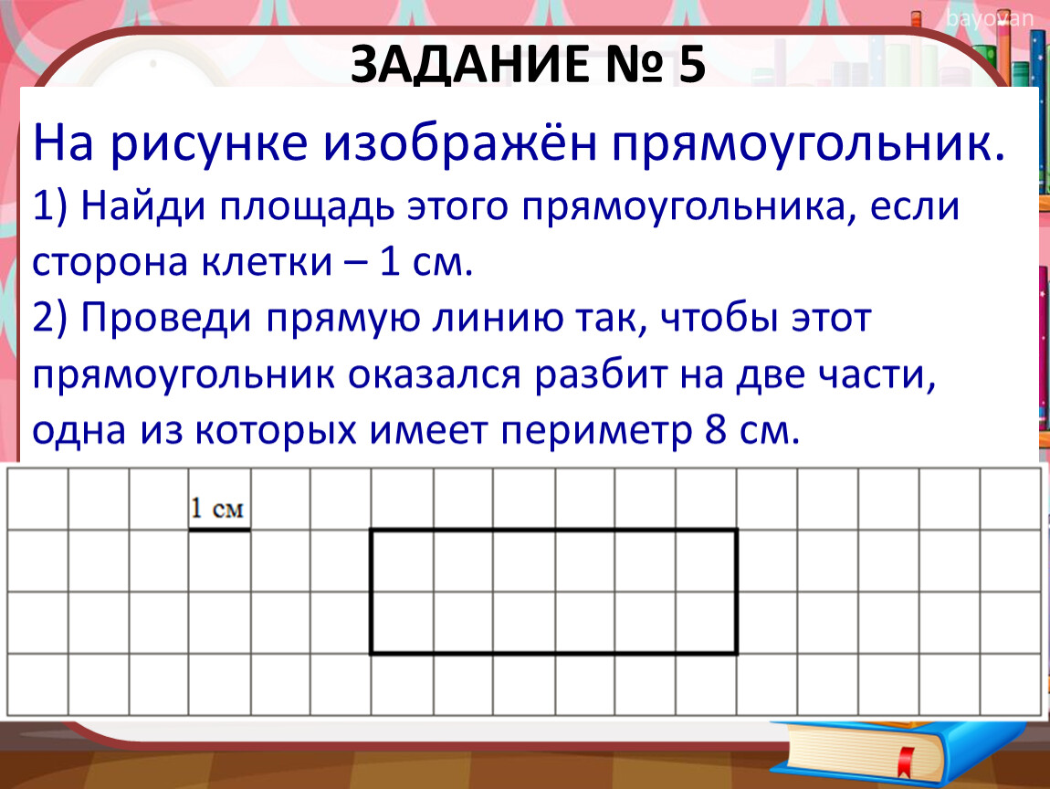 2) Проведи прямую линию так, чтобы этот прямоугольник оказался разбит на две части, одна из которых имеет периметр 8 см.