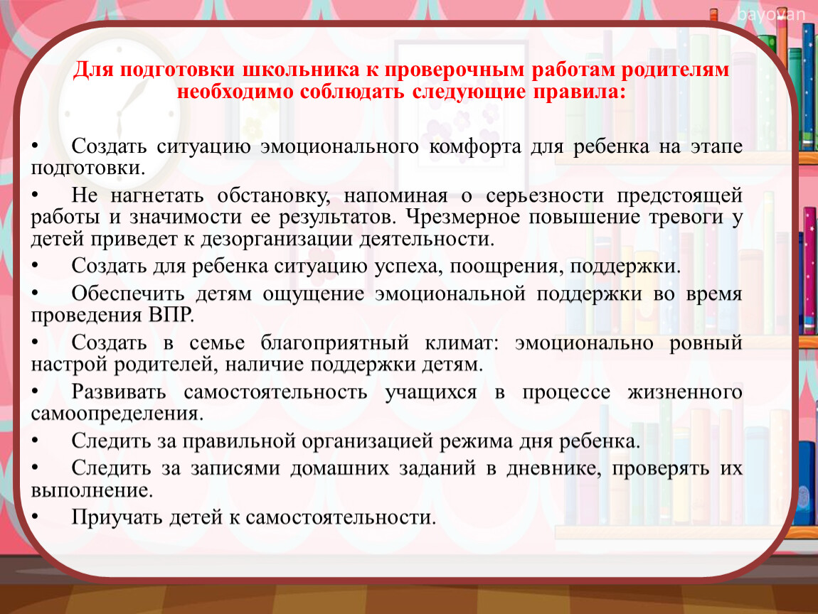 Для подготовки школьника к проверочным работам родителям необходимо соблюдать следующие правила: