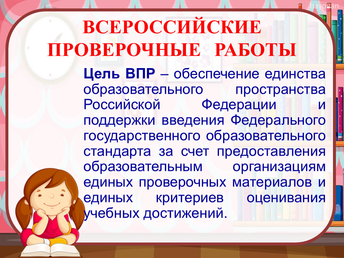 Цель ВПР – обеспечение единства образовательного пространства Российской Федерации и поддержки введения Федерального государственного образовательного стандарта за счет предоставления образовательным организациям единых проверочных материалов и единых критериев оценивания учебных достижений.