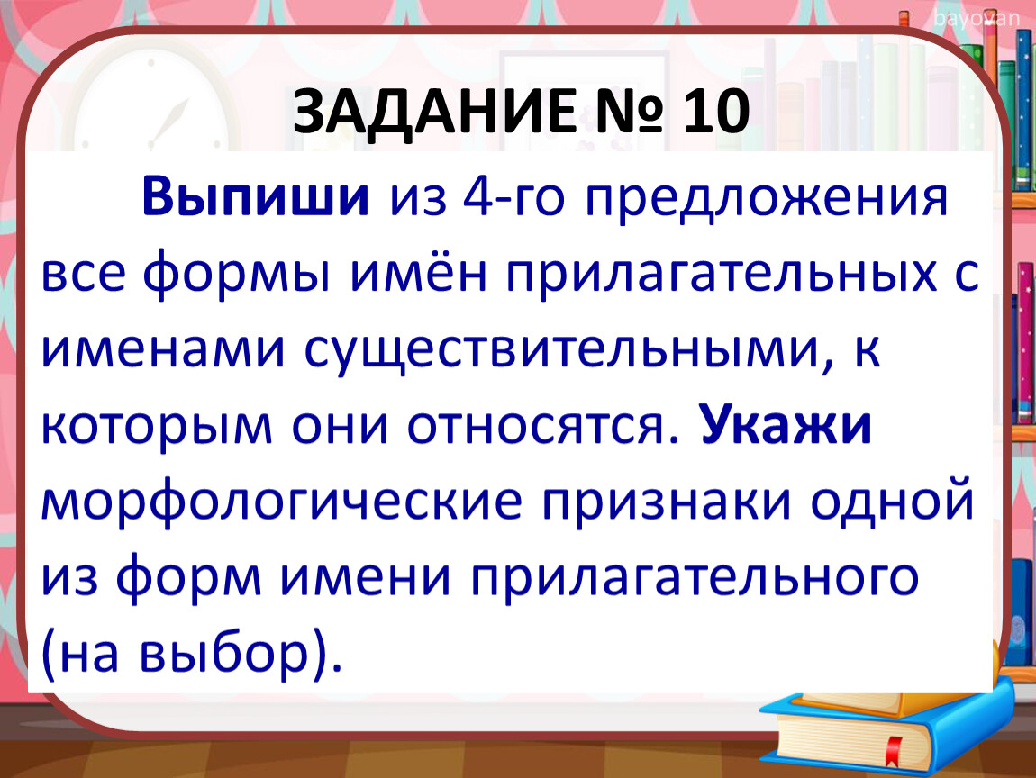 Выпиши из 4-го предложения все формы имён прилагательных с именами существительными, к которым они относятся. Укажи морфологические признаки одной из форм имени прилагательного (на выбор).