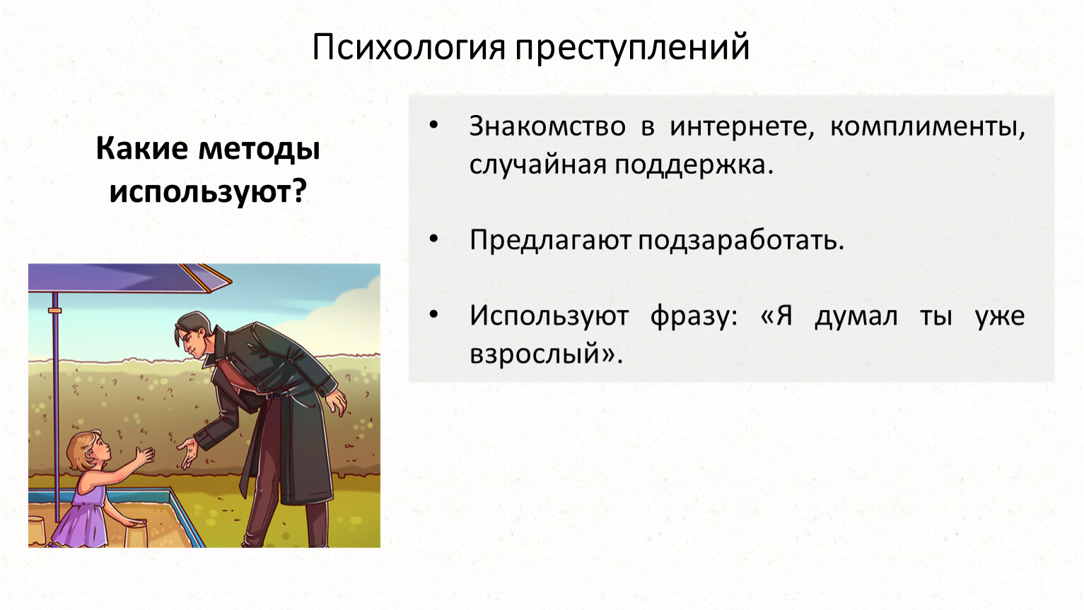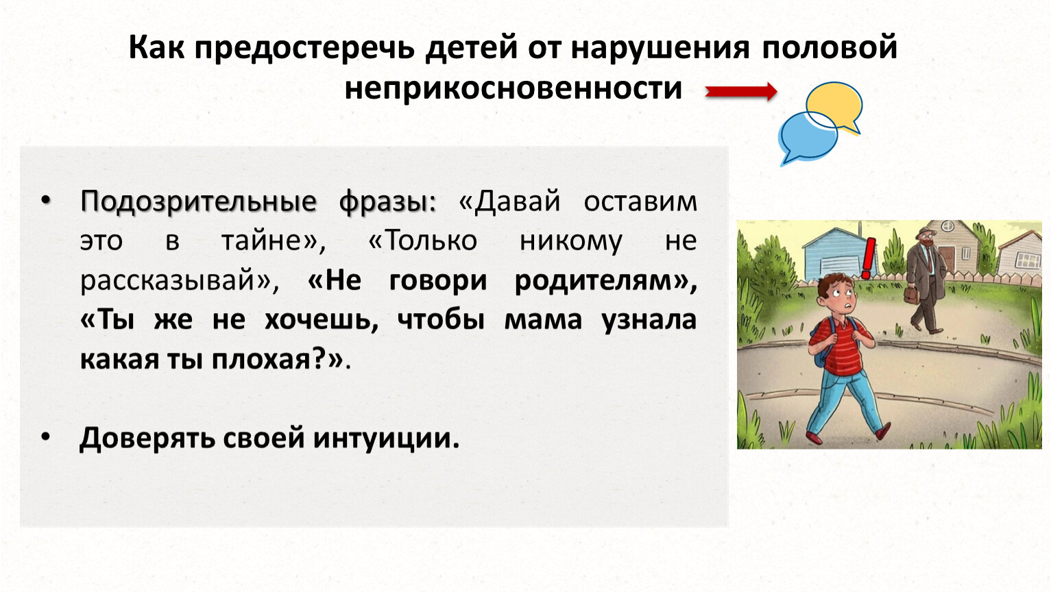 Подозрительные фразы: «Давай оставим это в тайне», «Только никому не рассказывай», «Не говори родителям», «Ты же не хочешь, чтобы мама узнала какая ты плохая?».