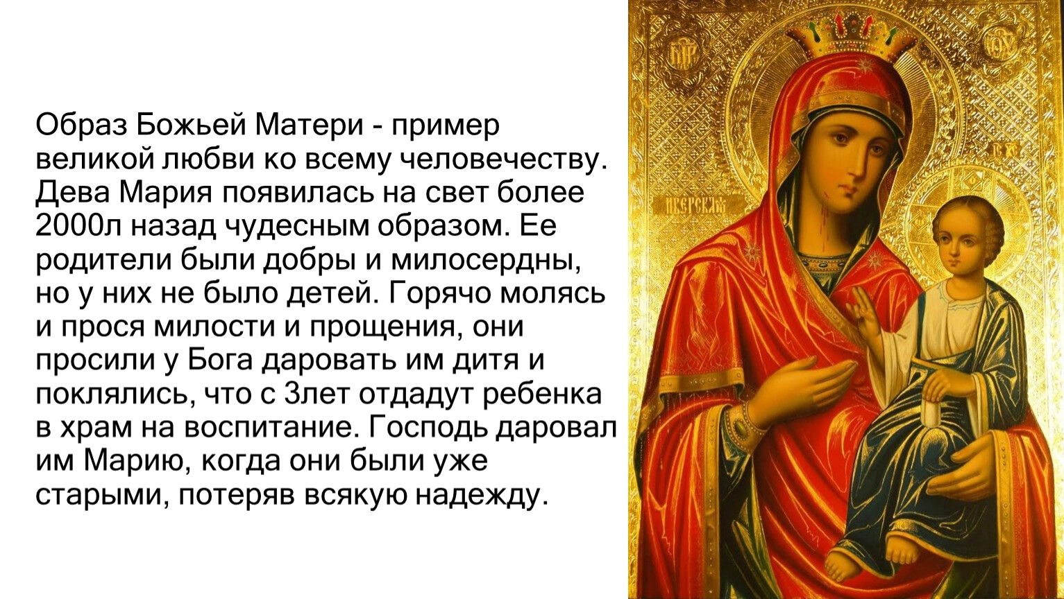 Образ Божьей Матери - пример великой любви ко всему человечеству. Дева Мария появилась на свет более 2000л назад чудесным образом. Ее родители были добры и милосердны, но у них не было детей. Горячо молясь и прося милости и прощения, они просили у Бога даровать им дитя и поклялись, что с 3лет отдадут ребенка в храм на воспитание. Господь даровал им Марию, когда они были уже старыми, потеряв всякую надежду.