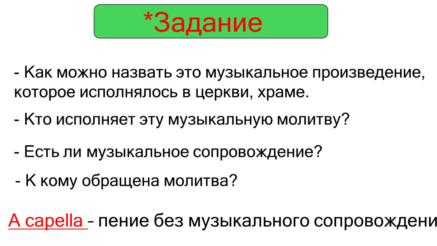 - Как можно назвать это музыкальное произведение, которое исполнялось в церкви, храме.