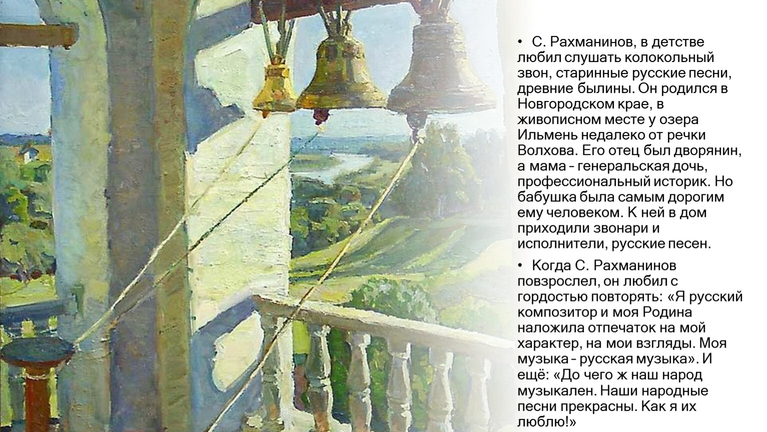 С. Рахманинов, в детстве любил слушать колокольный звон, старинные русские песни, древние былины. Он родился в Новгородском крае, в живописном месте у озера Ильмень недалеко от речки Волхова. Его отец был дворянин, а мама – генеральская дочь, профессиональный историк. Но бабушка была самым дорогим ему человеком. К ней в дом приходили звонари и исполнители, русские песен.