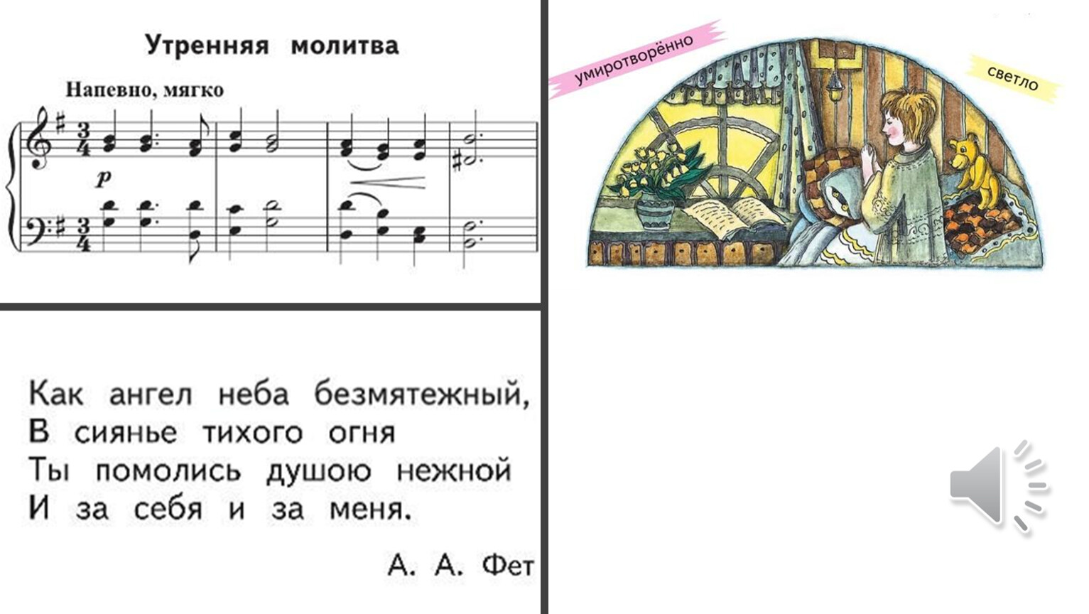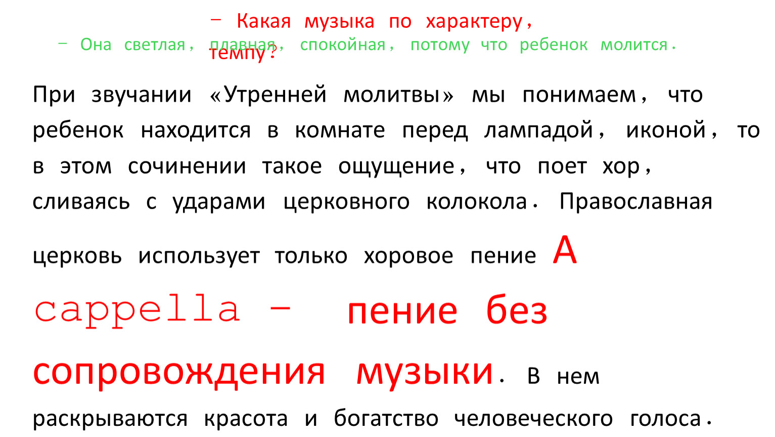 При звучании «Утренней молитвы» мы понимаем, что ребенок находится в комнате перед лампадой, иконой, то в этом сочинении такое ощущение, что поет хор, сливаясь с ударами церковного колокола. Православная церковь использует только хоровое пение А cappella - пение без сопровождения музыки. В нем раскрываются красота и богатство человеческого голоса.