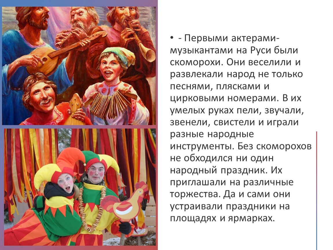 - Первыми актерами-музыкантами на Руси были скоморохи. Они веселили и развлекали народ не только песнями, плясками и цирковыми номерами. В их умелых руках пели, звучали, звенели, свистели и играли разные народные инструменты. Без скоморохов не обходился ни один народный праздник. Их приглашали на различные торжества. Да и сами они устраивали праздники на площадях и ярмарках.