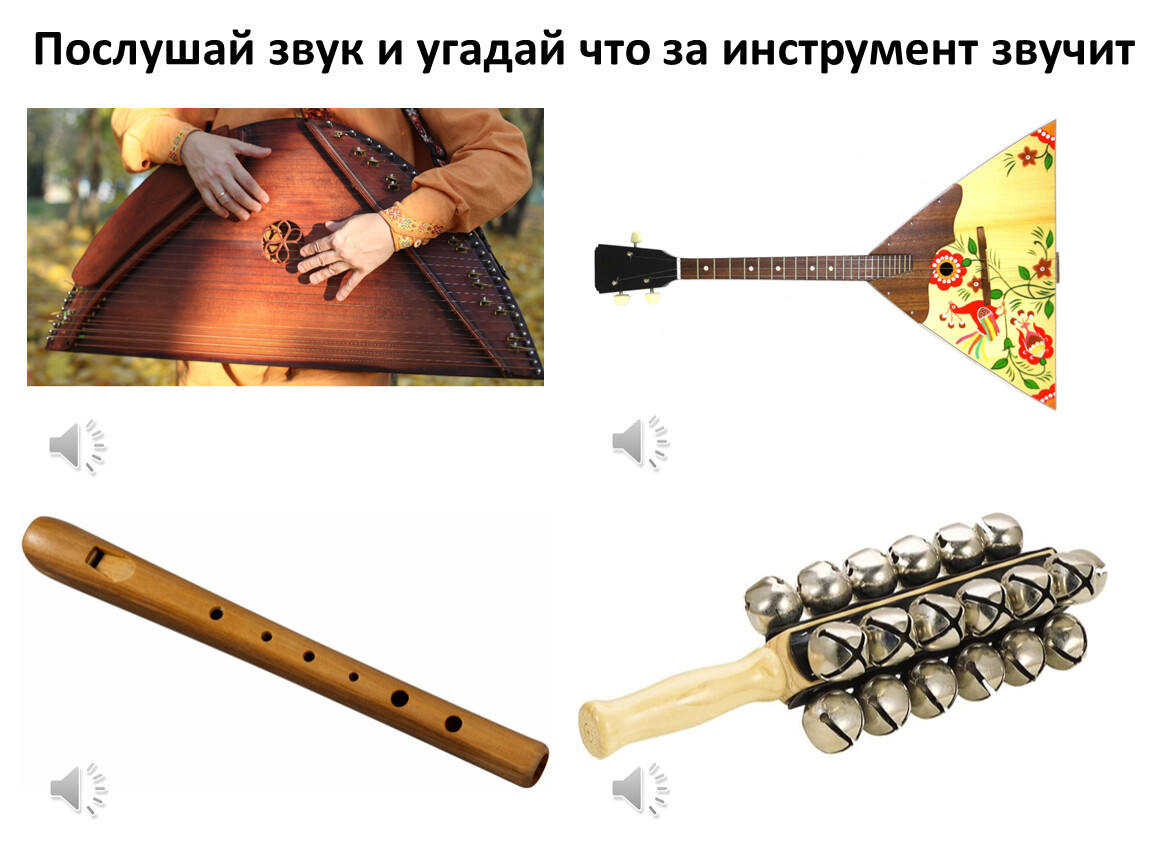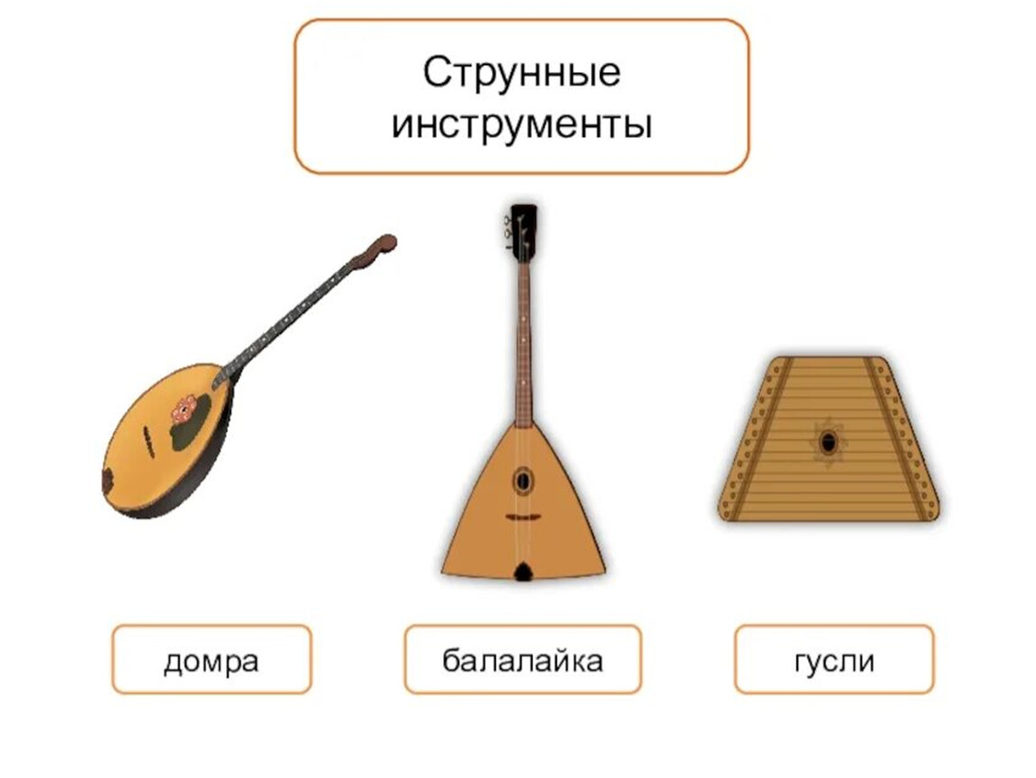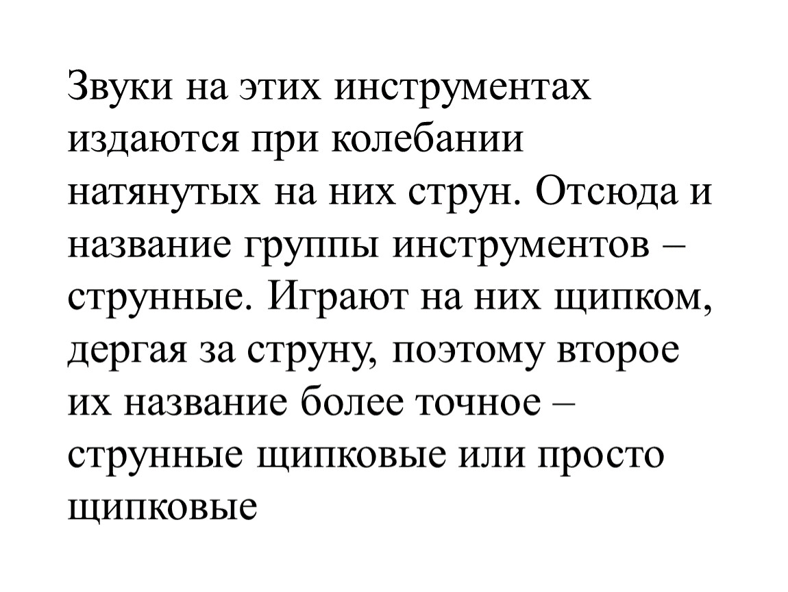 Звуки на этих инструментах издаются при колебании натянутых на них струн. Отсюда и название группы инструментов – струнные. Играют на них щипком, дергая за струну, поэтому второе их название более точное – струнные щипковые или просто щипковые