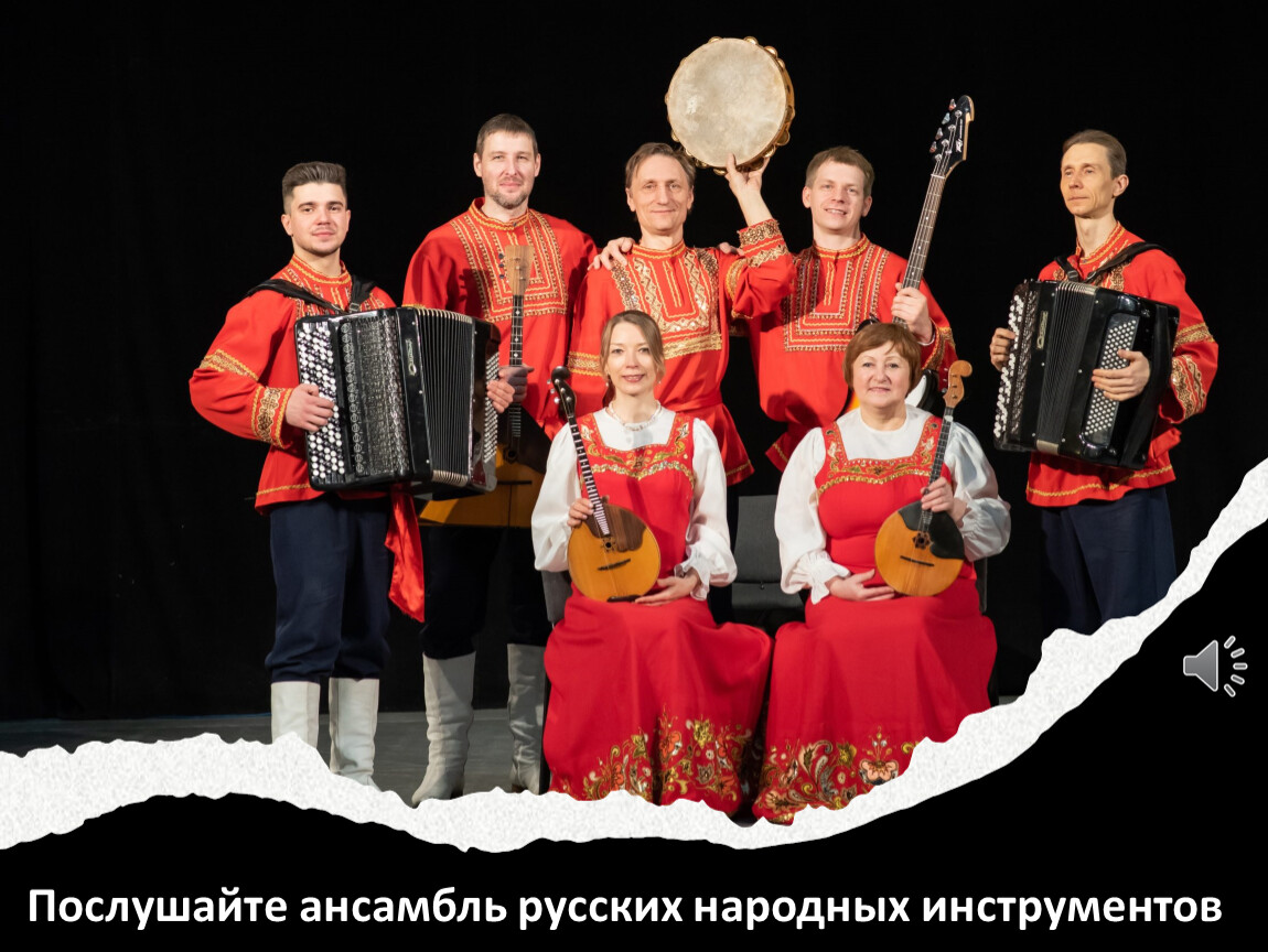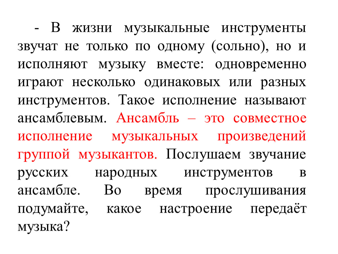 - В жизни музыкальные инструменты звучат не только по одному (сольно), но и исполняют музыку вместе: одновременно играют несколько одинаковых или разных инструментов. Такое исполнение называют ансамблевым. Ансамбль – это совместное исполнение музыкальных произведений группой музыкантов. Послушаем звучание русских народных инструментов в ансамбле. Во время прослушивания подумайте, какое настроение передаёт музыка?
