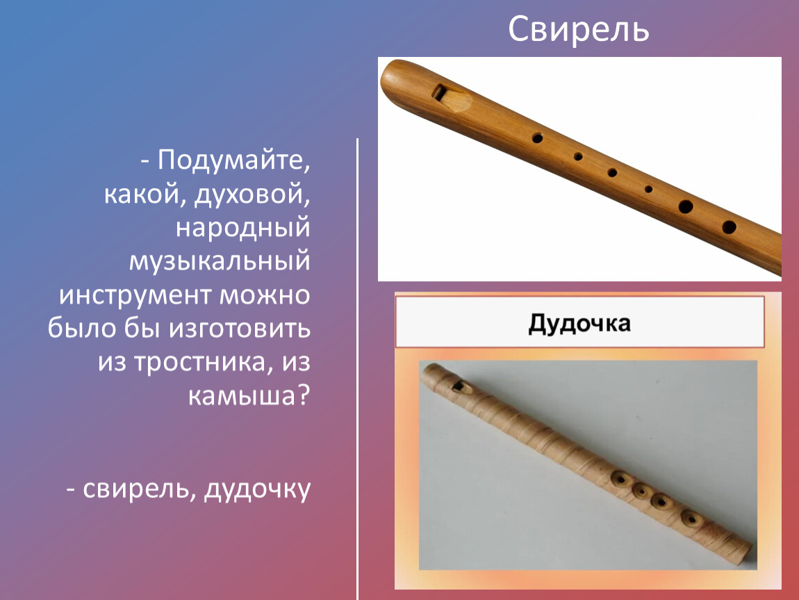 - Подумайте, какой, духовой, народный музыкальный инструмент можно было бы изготовить из тростника, из камыша?