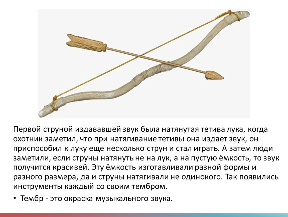 Первой струной издававшей звук была натянутая тетива лука, когда охотник заметил, что при натягивание тетивы она издает звук, он приспособил к луку еще несколько струн и стал играть. А затем люди заметили, если струны натянуть не на лук, а на пустую ёмкость, то звук получится красивей. Эту ёмкость изготавливали разной формы и разного размера, да и струны натягивали не одинокого. Так появились инструменты каждый со своим тембром.