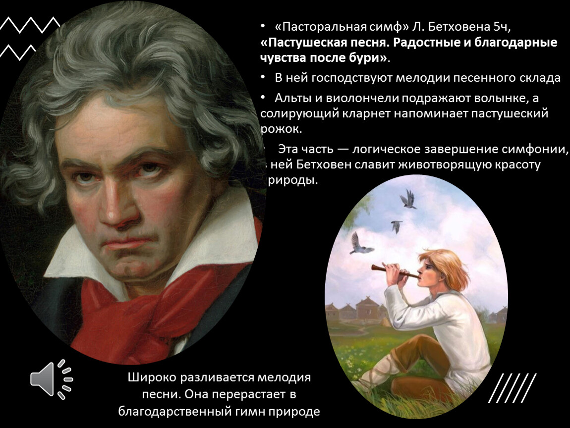 «Пасторальная симф» Л. Бетховена 5ч, «Пастушеская песня. Радостные и благодарные чувства после бури».