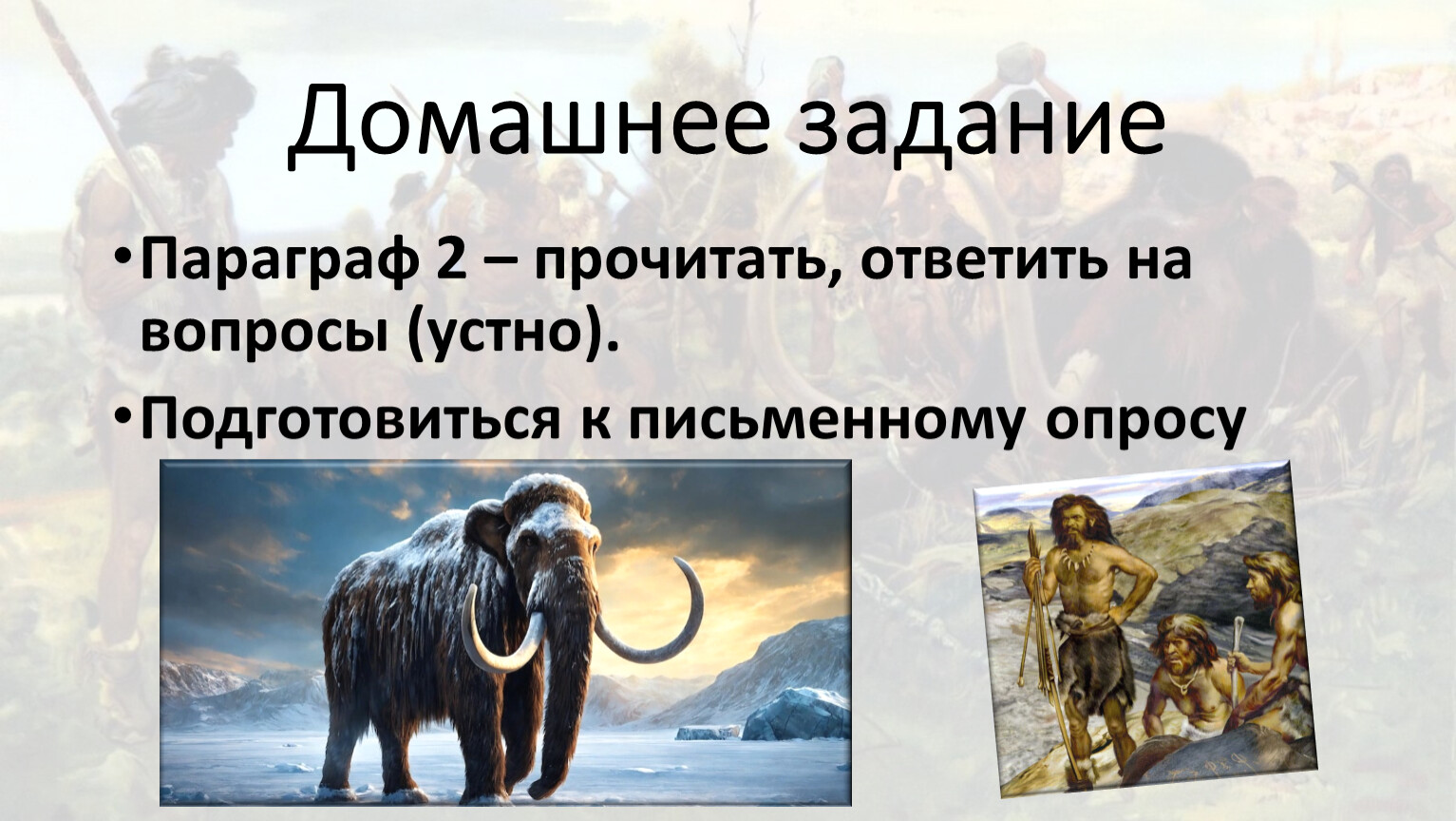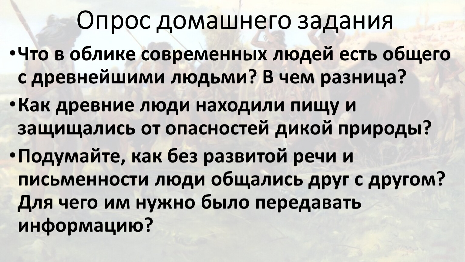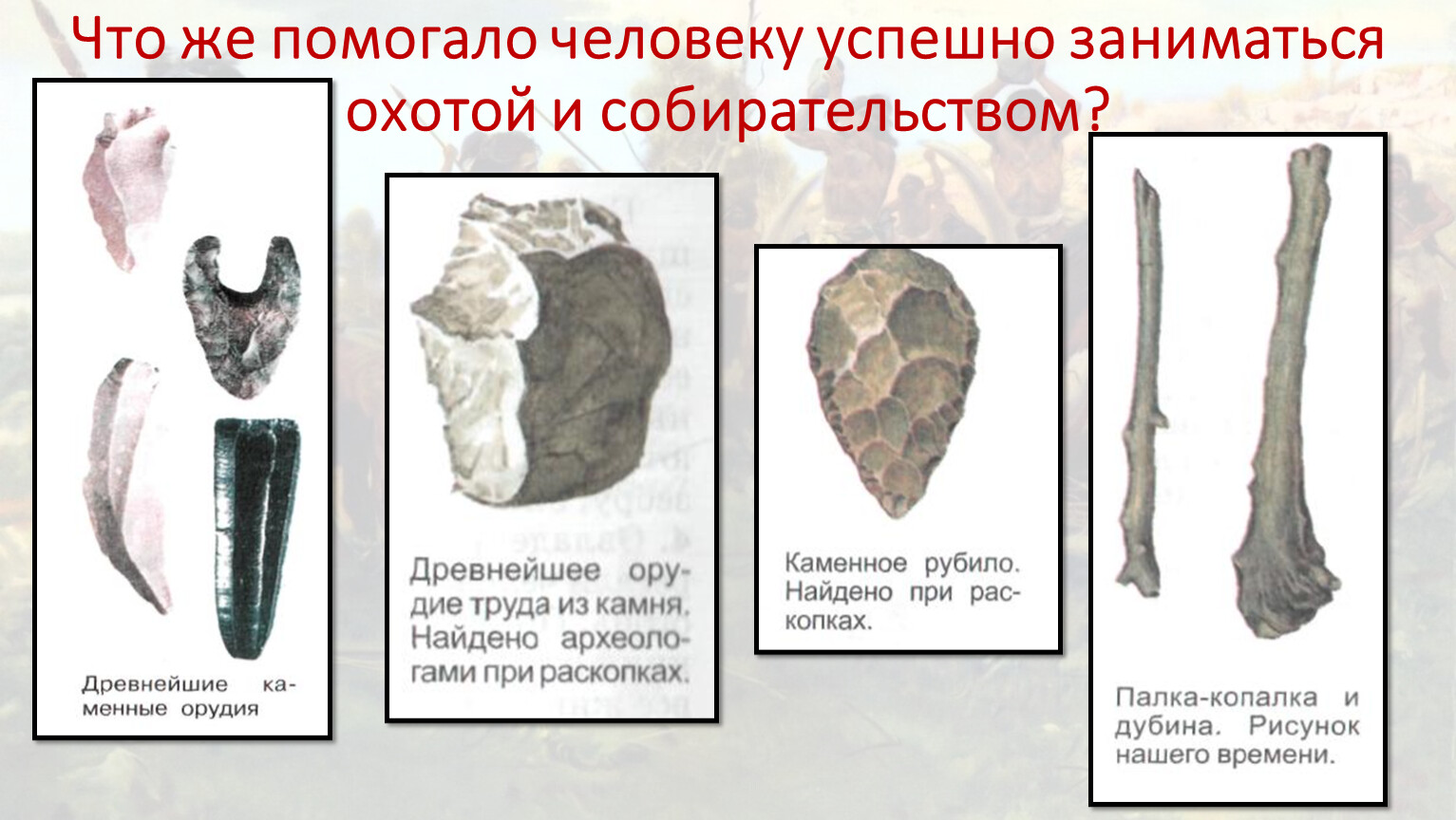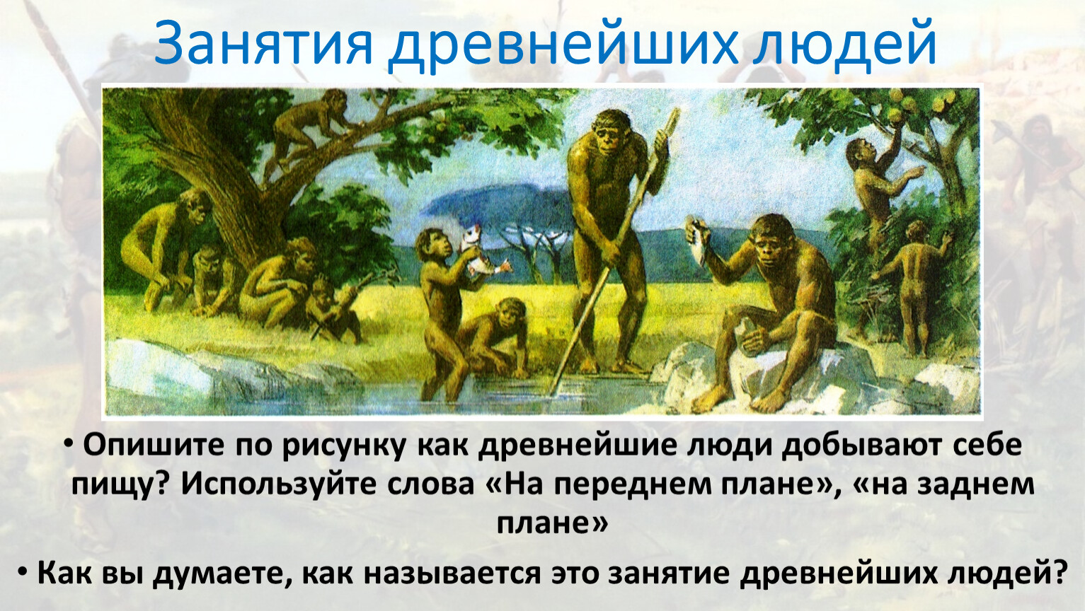 Опишите по рисунку как древнейшие люди добывают себе пищу? Используйте слова «На переднем плане», «на заднем плане»