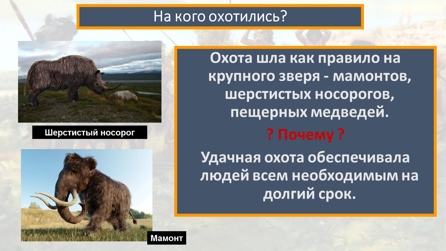 Охота шла как правило на крупного зверя - мамонтов, шерстистых носорогов, пещерных медведей.