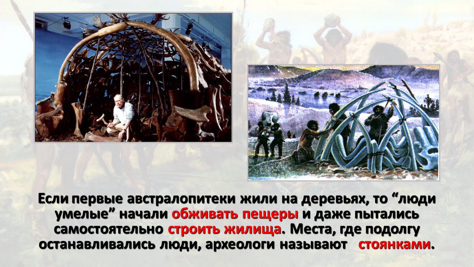 Если первые австралопитеки жили на деревьях, то “люди умелые” начали обживать пещеры и даже пытались самостоятельно строить жилища. Места, где подолгу останавливались люди, археологи называют стоянками.